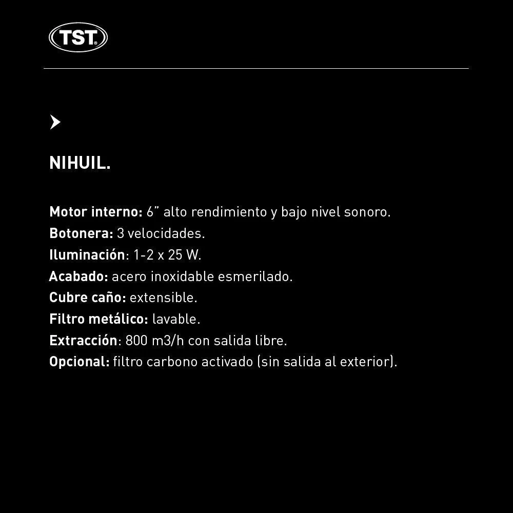 características: motor interno: 6” de alto rendimiento y bajo nivel sonoro. comando: pulsante. iluminación: 1-2 x 25 w acabado: acero inoxidable esmerilado. cubre caño: extensible. filtro: metálico lavable. extracción: 800 m3/h con salida libre. medidas: 600-750-900 mm. opcional: filtro carbono activado (sin salida al exterior). cubre caño x 98cm. persiana móvil. producto certificado @tstargentina 270 95 310 275 min 480 - max 950 40 600 - 750 - 900 510 ø150 velocidades: 3 (v1-v2-v3). nivel de ruido (db)*: 66 (v1) - 58 (v3) *(instalación 6” con salida recta). potencia del motor: 182 w.
